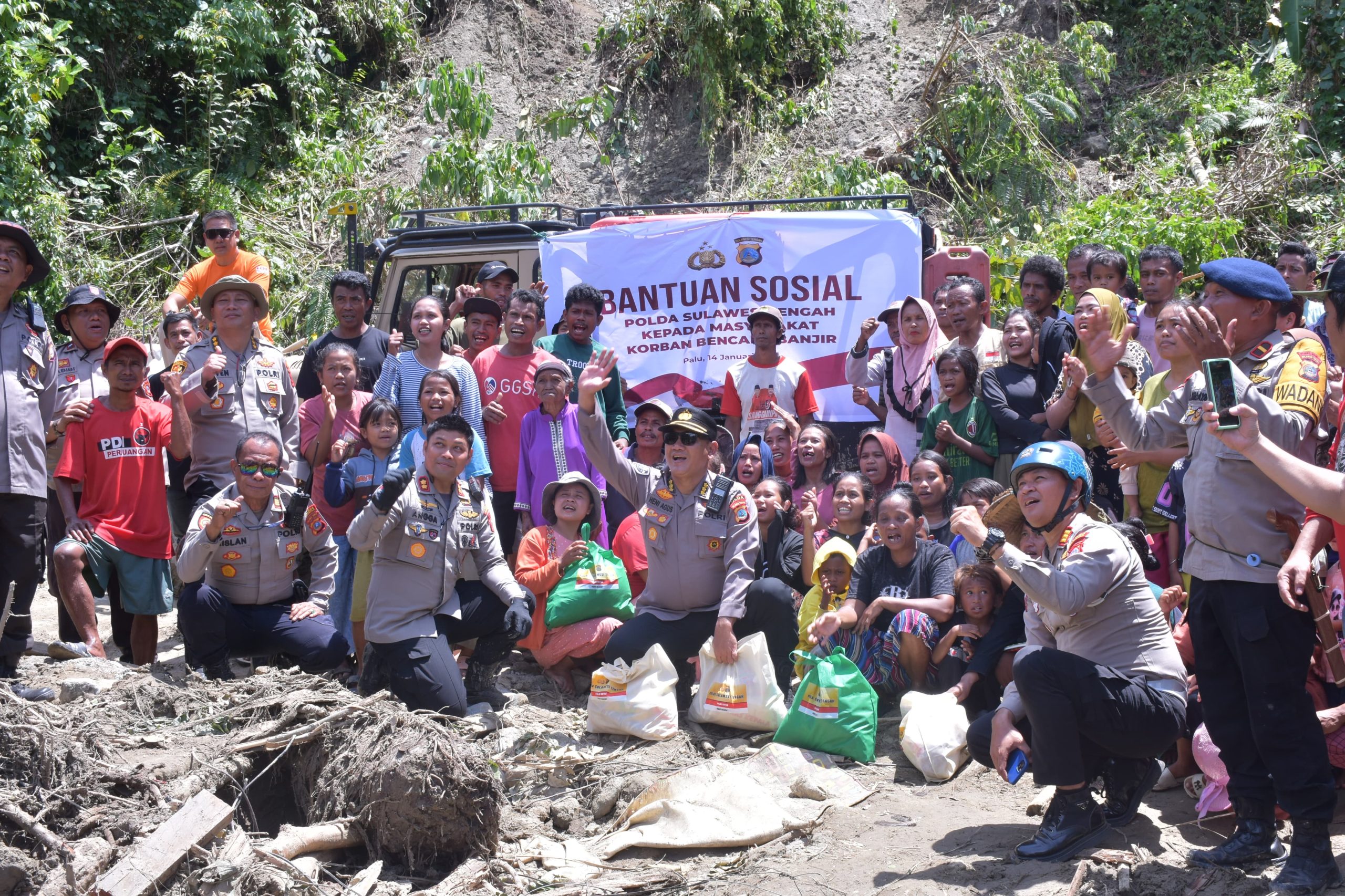 Distribusi bantuan dilakukan langsung ke lokasi terdampak dengan melibatkan komunitas Bhayangkara Tadulako Offroad sebanyak 12 unit kendaraan dan Bhayangkara Vespa Tadulako sebanyak delapan unit kendaraan.