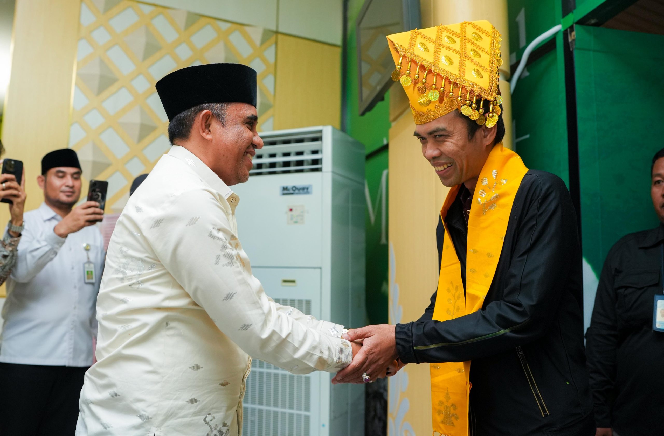 Sambutan hangat diberikan Gubernur bersama jajaran Pemerintah Provinsi Sulteng kepada dai nasional tersebut.UAS hadir di Palu untuk mengisi rangkaian kegiatan peresmian Masjid Raya Baitul Khairaat Provinsi Sulawesi Tengah.