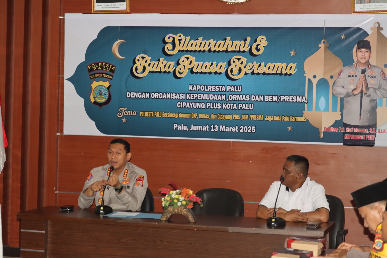 Palu – Kapolresta Palu Kombes Pol. Hari Rosena, S.H., S.I.K., M.Si. menggelar silaturahmi dan buka puasa bersama dengan organisasi kepemudaan, organisasi masyarakat (ormas), serta Badan Eksekutif Mahasiswa (BEM/Presma) yang tergabung dalam Cipayung Plus Kota Palu, Jumat 13/3/26.