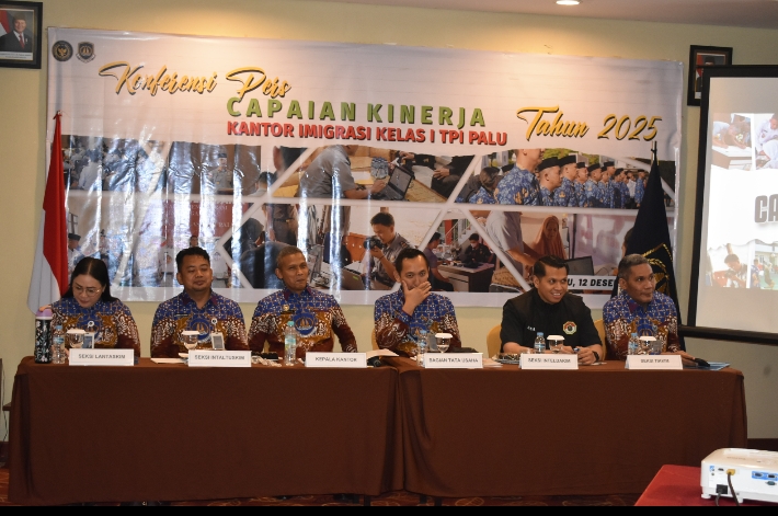 PALU – Kantor Imigrasi Kelas I TPI Palu memaparkan hasil kinerja periode Januari–Desember 2025 dalam konferensi pers yang digelar di Hotel Best Western Plus Coco Palu, Jumat 12/12.