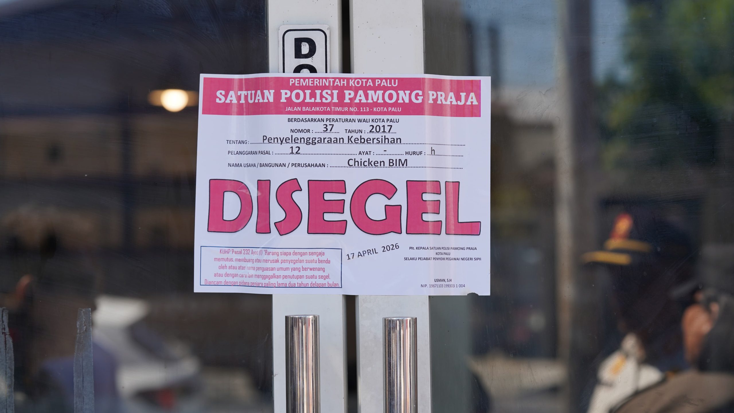 Palu – Pemerintah Kota Palu melalui Satuan Polisi Pamong Praja (Satpol PP) bersama aparat penegak hukum melakukan penyegelan sementara terhadap usaha Chicken Bin di Jalan Basuki Rahmat, Jumat 17/4/26.