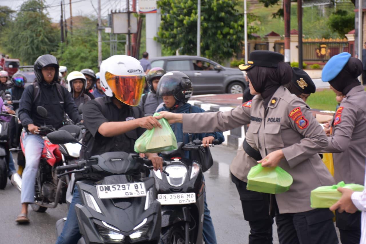 Sejak pukul 16.00 WITA, para Polwan tampak menyapa pengendara roda dua dan roda empat yang melintas sambil membagikan takjil untuk berbuka puasa.