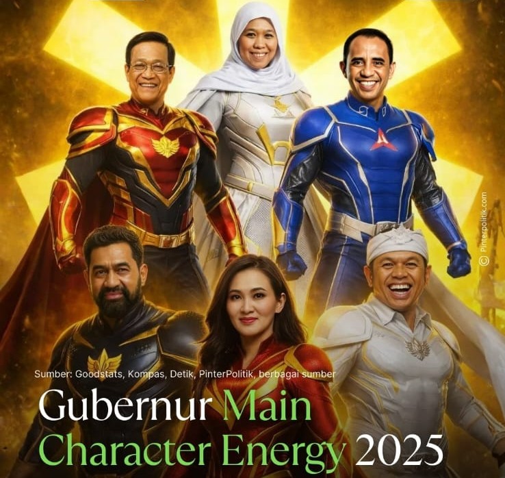 Unggahan @pinterpolitik menggambarkan keenam gubernur sebagai sosok berkarakter, divisualisasikan layaknya super hero dengan kostum khas masing-masing. Postingan bertajuk “Gubernur Main Character Energy 2025” itu tampil di halaman utama dan meraih 6.415 likes, ratusan komentar, serta ratusan kali dibagikan.