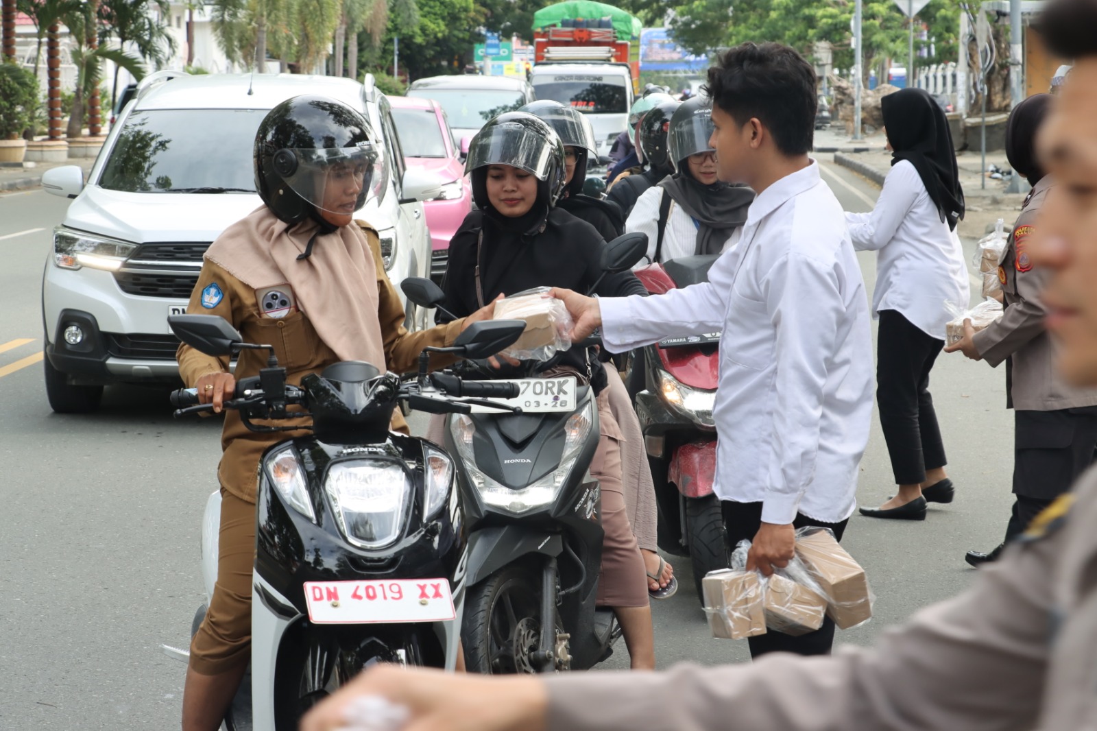 Takjil dibagikan kepada pengendara roda dua maupun roda empat yang melintas sebagai bentuk kepedulian Polri kepada masyarakat yang sedang menjalankan ibadah puasa di bulan suci Ramadhan 1447 Hijriah.