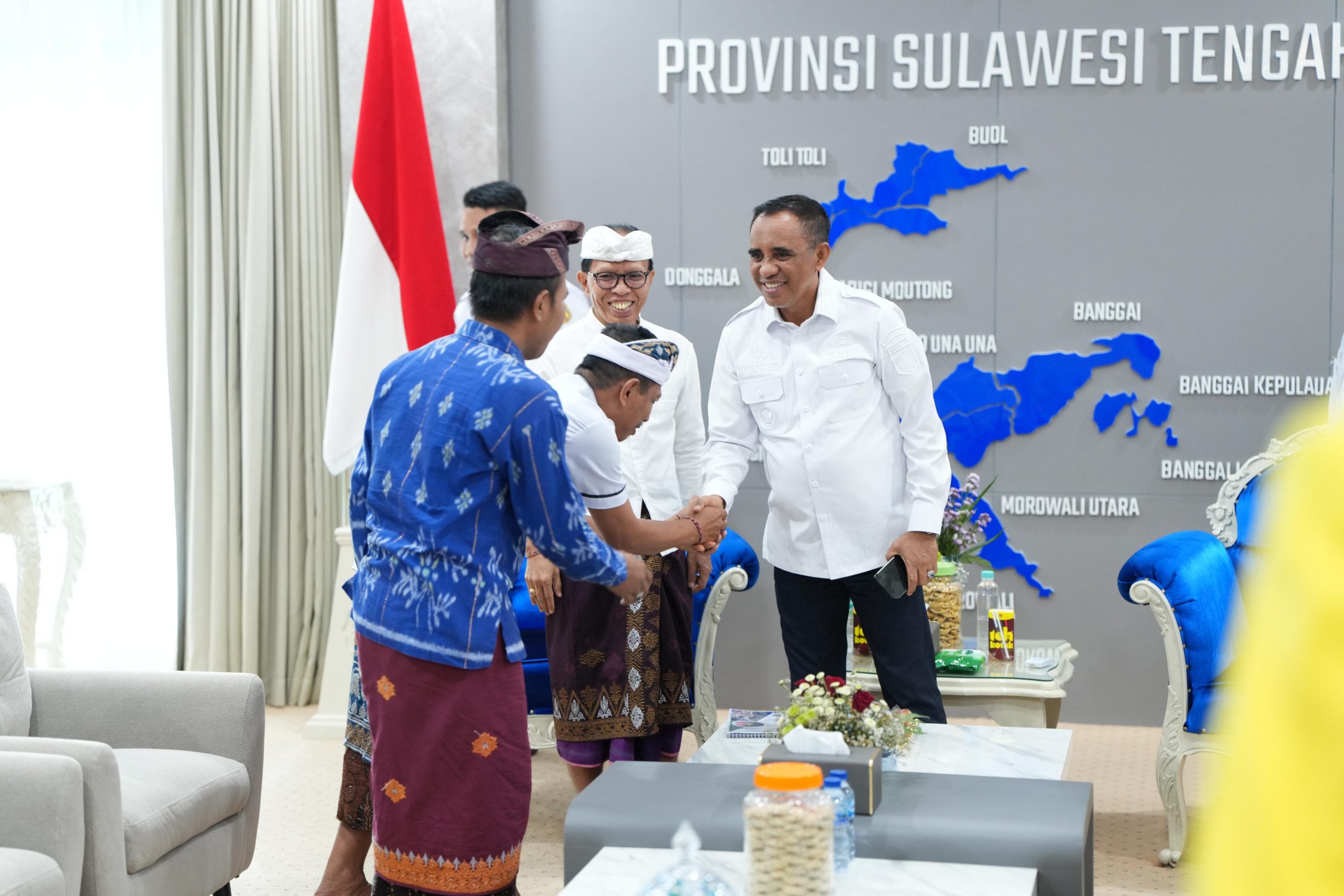 PALU — Gubernur Sulawesi Tengah, Dr. H. Anwar Hafid, M.Si, menerima audiensi Direktur Jenderal Bimbingan Masyarakat Hindu Kementerian Agama RI, Prof. Dr. Drs. I Nengah Duija, M.Si, bersama rombongan Lembaga Pembinaan dan Pengembangan Dharma Gita (LPTDG) Pusat di ruang kerjanya, Rabu 5/11/.
